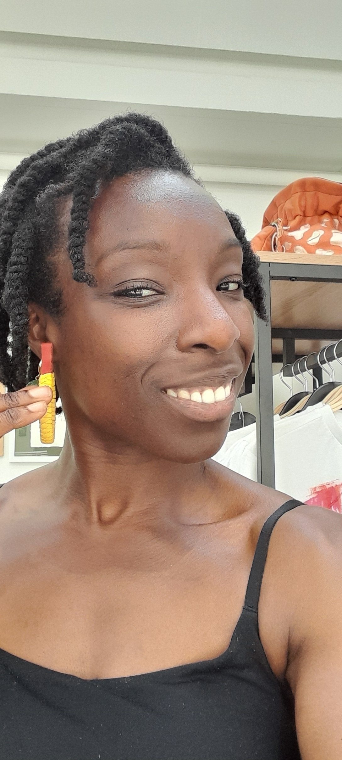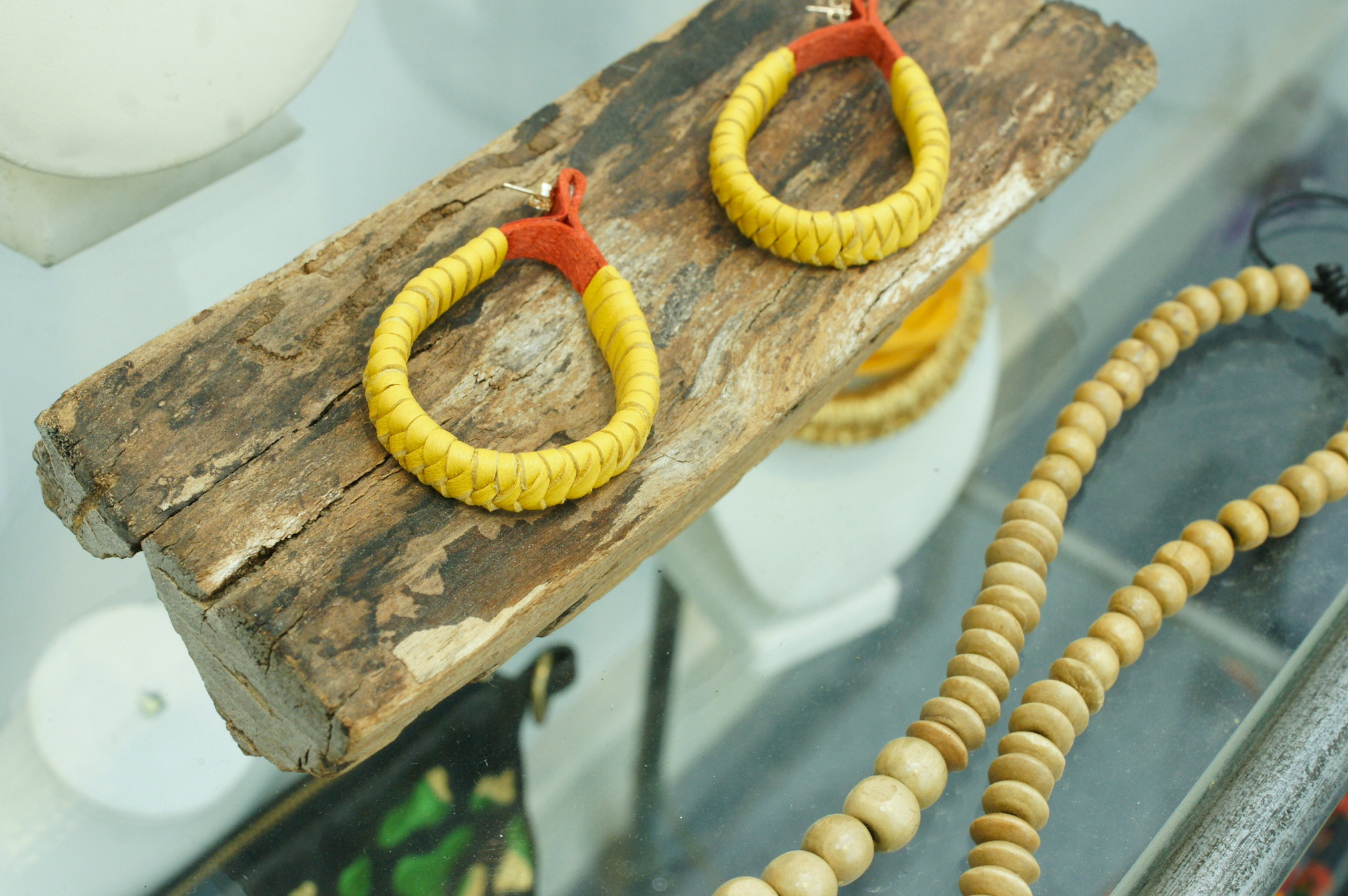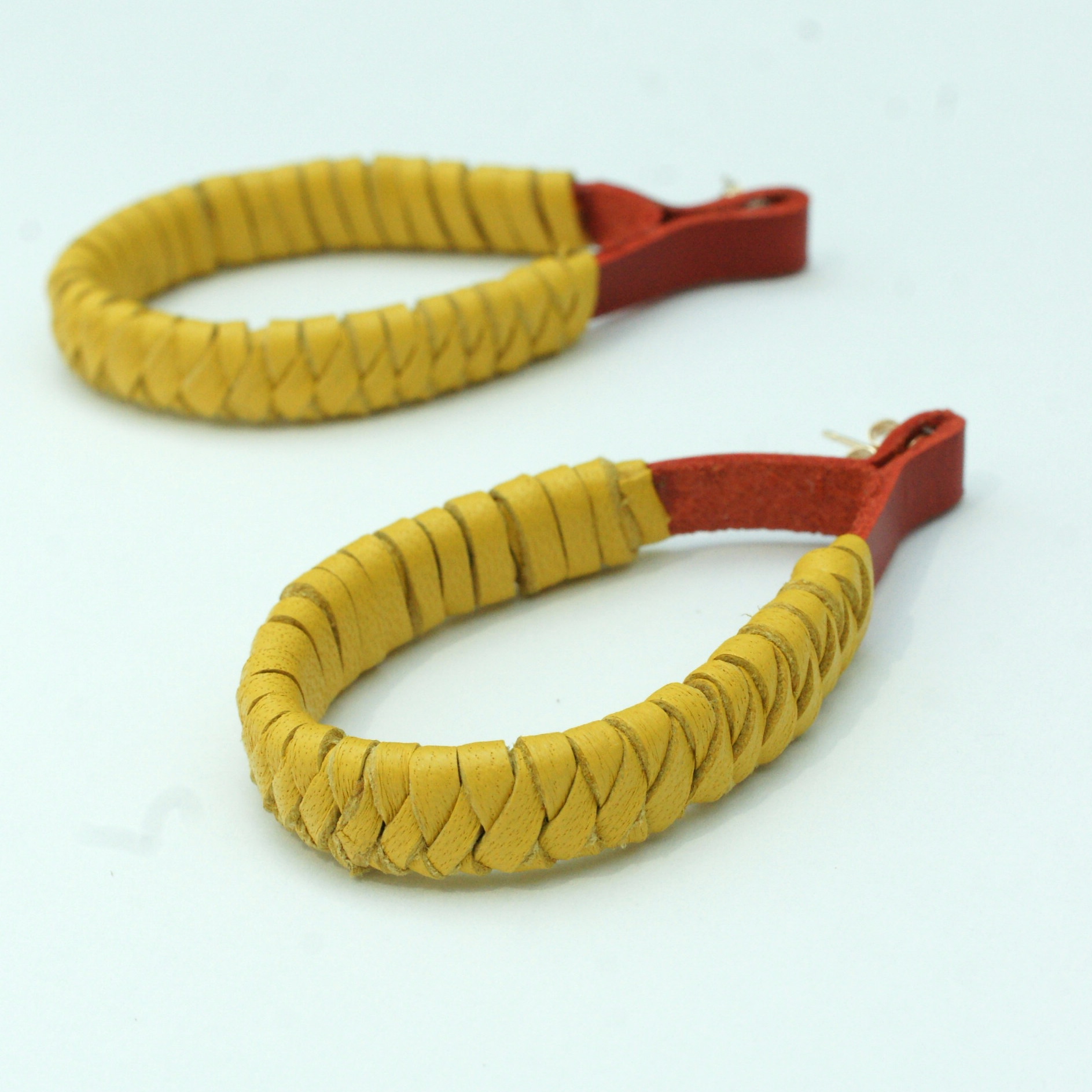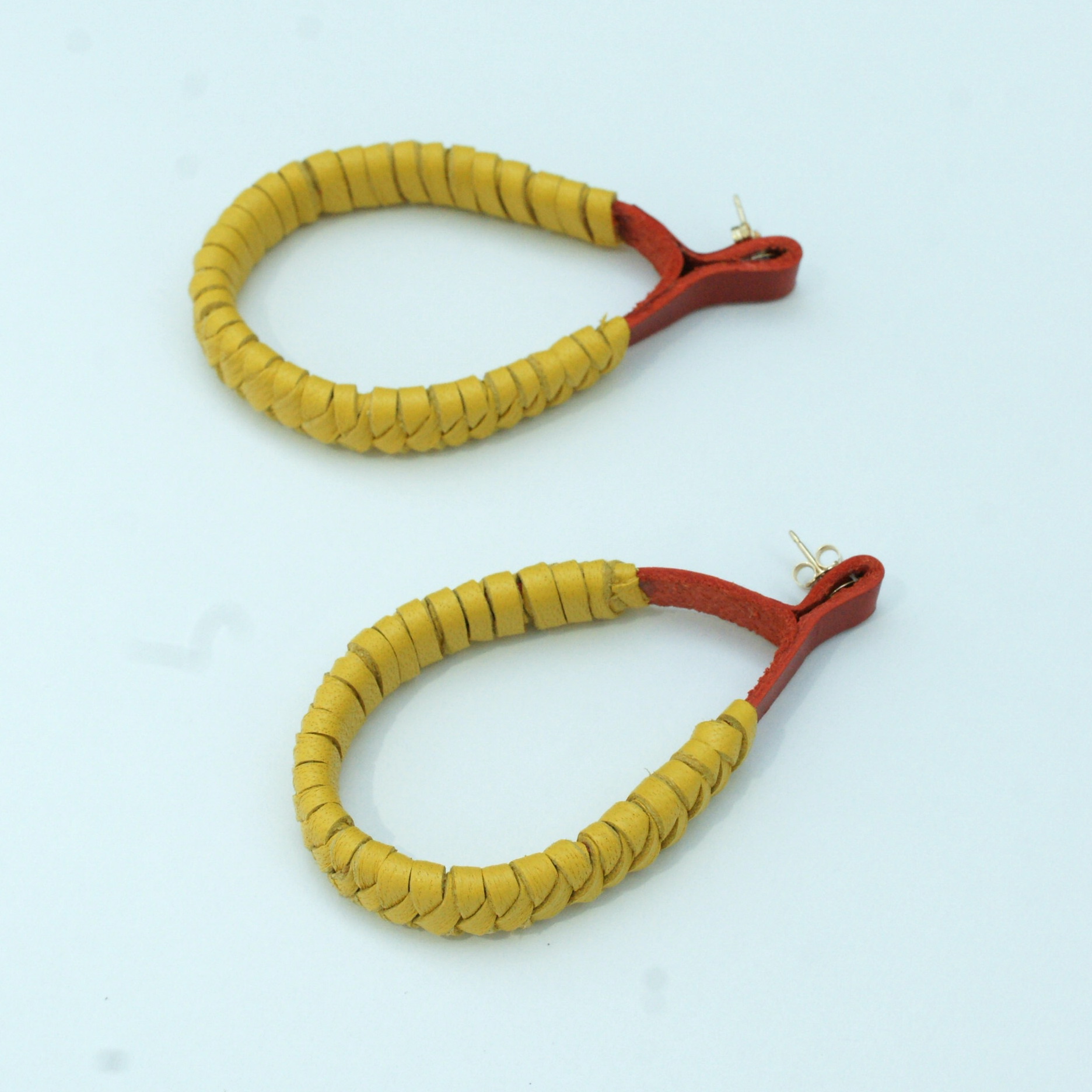 Gorgeous yellow and red woven leather earrings designed and made by Amma Gyan at the House of Amma – The Art of Living.